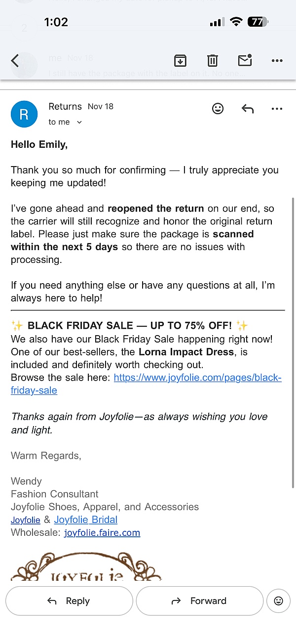 I have been waiting on a refund for an item I returned that was not used and returned just as I received it. Joyfolie keeps stating that they flagged for review to expedite my refund; however, I have sent several emails to follow-up and I keep getting one excuse after another. Returns are not handled appropriately. Having no customer service phone number is another negative and red flag. Consider other merchants.