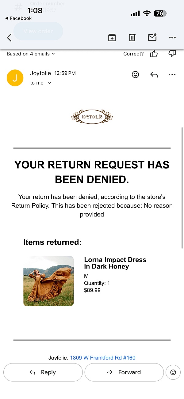 BUYER BEWARE: I had so much hope ordering from Joyfolie. There were good reviews so I thought I would try. I did not like this dress on me and it was a little big. I initiated a return. I had the package outside (as I paid for them to have it picked up) and no one came. They canceled my return, but then reversed the cancellation. Once they received it, they sent me a message saying that my return was denied for "no reason provided" Well I of course emailed them and they claimed there was hair on the dress and a smell. That was ABSOLUTELY UNTRUE. I tried this on for engagement pictures, didn't like it, and IMMEDIATELY put it back in the original packaging. They sent me a photo that showed maybe a little blonde looking hair? (See photo) and I have dark brown hair. This is absolute robbery. If you need to do a return, good luck. They had the audacity to say I could pay them to have it returned back to me. In the email they also included that I could go buy more items because they are having a sale. Are you kidding? I will never purchase anything from a company that steals from their customers. This was SO disappointing. I would never send back an item for a return that was not in perfect condition. It wasn't even out of the package for 5 mins. Spent over $100 for NOTHING. Lesson learned. Again, I attached the picture they sent me as their "reasoning". It came to me wrinkled like that. Guarantee they will repackage it and sell it. I have never left a negative review on any site before, but this was absurd. NOT WORTH THE RISK.