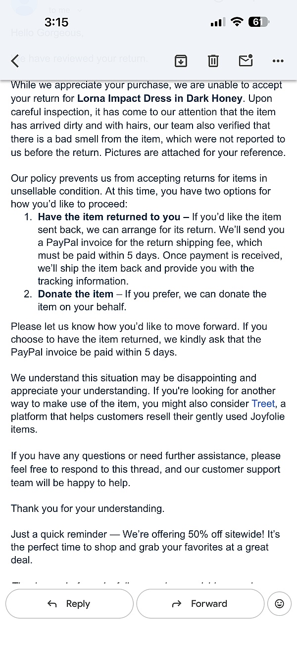 I was looking for a special occasion dress for both my daughters and I. Went I went to google and typed mother/daughter dresses, Joyfolie came up. As soon as I went on the sight, it asked me to spin a wheel for a discount. I was thrilled to "land on" a 30% discount. The total for 6 dresses (2 options for each of us) was $383 WITH the 30%. None of the dresses worked and the quality was very poor for the prices. So, imagine my shock when I went to return them and I CANNOT. I can only get store credit because I used the discounted code. Not only do I not have dresses that work and I still have to purchase something, now I am stuck with the company to the tune of almost $400.