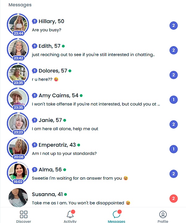 At first, I was disappointed because the women were all very young. 30 through 45. Not my choice they're too young for me. Women in their 50s were very nice to talk to but again they are a little too young for me. I met some women in their upper 50s and 60s and that made a big difference. The women that are in the area that I live just want to text back-and-forth. I don't mind doing that a little, but you get better vibes if you can meet them one on one. I can understand a woman being standoffish. But now I am giving them a synopsis of me will go from there.