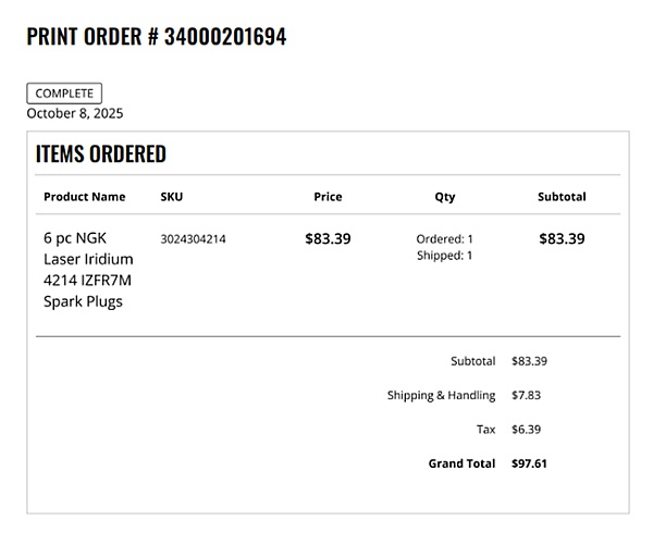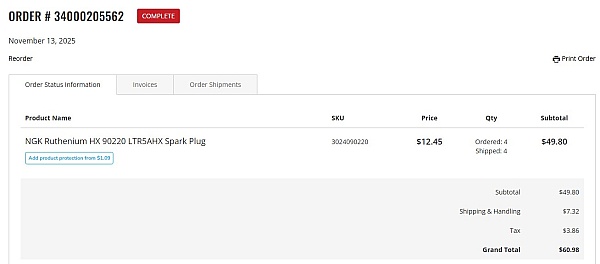 Ordered four (4) sparkplugs to do a tune up and received two (2) with a note for a separate shipment. Called 0Sixty and found they refunded me for the two plugs. I go back on line to Amazon and 0Sixty still indicates they have plugs in stock, yet call to customer support indicates their warehouses are out of stock. Won't be ordering from them again.